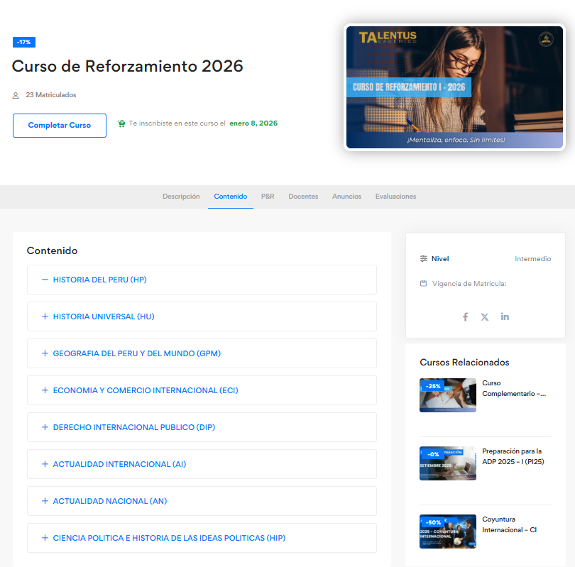 El curso está orientado a consolidar conocimientos, fortalecer contenidos clave y afianzar la preparación académica, en función de las exigencias del proceso de admisión a la Academia Diplomática. El reforzamiento permite repasar temas fundamentales y corregir vacíos académicos detectados durante la etapa previa de preparación.