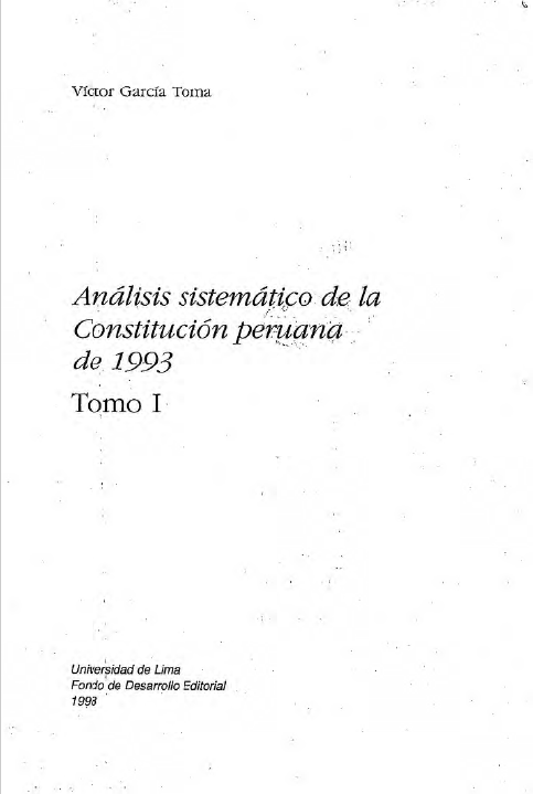 El Análisis sistemático de la Constitución peruana de 1993, Tomo I (1998), de Víctor García Toma, constituye un estudio doctrinal detallado de los fundamentos, principios y estructura del texto constitucional vigente en el Perú, examinando su génesis histórica, su orientación ideológica y su diseño institucional. La obra desarrolla el alcance de los derechos fundamentales, los principios del Estado constitucional de derecho y la organización del poder público, interpretando cada disposición a la luz de la teoría constitucional contemporánea y la jurisprudencia relevante. Con un enfoque sistemático y pedagógico, el autor explica la lógica interna de la Constitución, su función como norma suprema y su papel en la consolidación del orden democrático, ofreciendo herramientas analíticas indispensables para estudiantes, juristas y operadores del sistema jurídico peruano.
