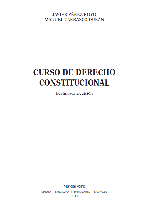 El Curso de Derecho Constitucional (16.ª ed., 2018), de Javier Pérez Royo y Manuel Carrasco Durán, presenta una síntesis rigurosa de los fundamentos del constitucionalismo contemporáneo, explicando la formación histórica del Estado constitucional, la supremacía normativa de la Constitución y el sistema de garantías que asegura su eficacia. La obra examina los principios estructurales del Estado democrático y social de derecho, la separación de poderes, el sistema de fuentes, la justicia constitucional y la protección de los derechos fundamentales, con especial referencia al modelo español y al derecho comparado europeo. Con un enfoque didáctico y sistemático, el texto ofrece las bases teóricas indispensables para comprender el funcionamiento del orden constitucional y la relación entre poder público, ciudadanía y Estado de derecho.